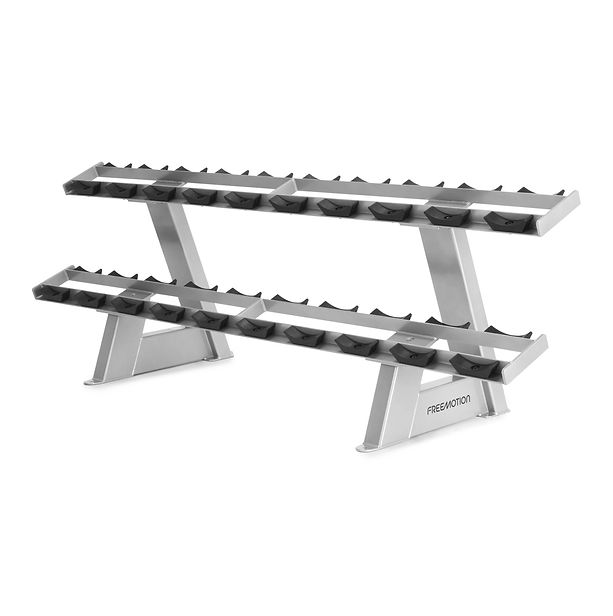 Give members a safe, reliable organized workout with the EPIC Twin Tier Dumbbell Rack. This Freemotion rack holds up to 20 standard dumbbells (up to 2,500 lb) with molded dumbbell holders to protect the weights and prevent rolling. Bolt-down holes can be fastened to the floor for added stability; heavy-duty steel and electrostatically powder-coated give it a sleek finish.